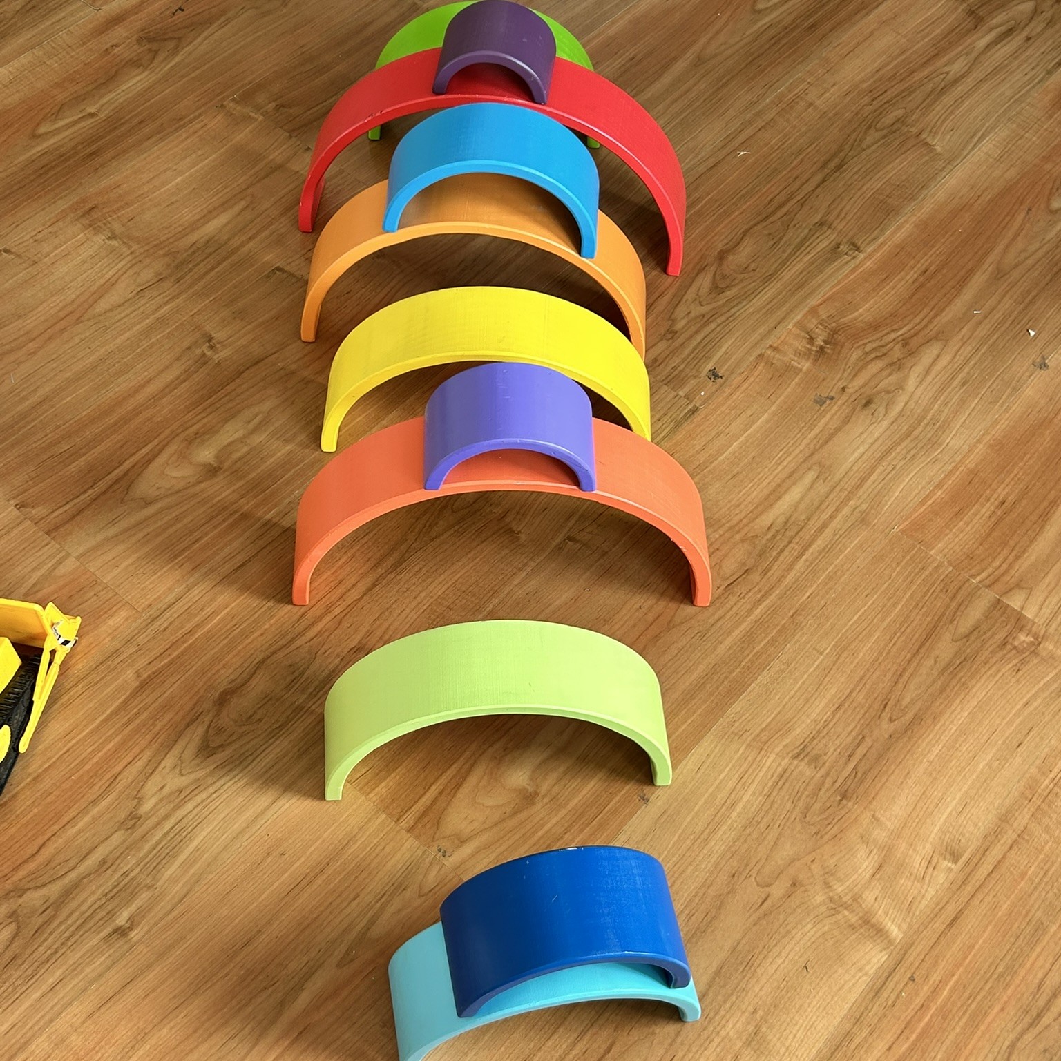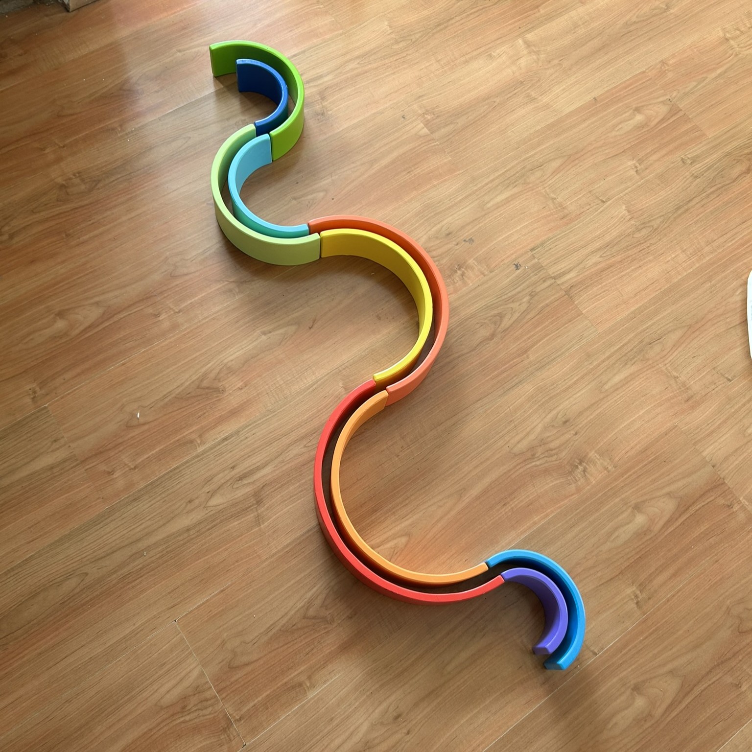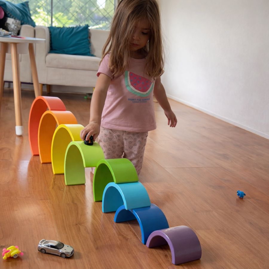 El arcoíris Waldorf de madera es un clásico del juego abierto que acompaña el desarrollo infantil a través de la exploración, la imaginación y la creatividad. Sus piezas de distintos tamaños y colores permiten a los niños construir estructuras, crear túneles, puentes o simplemente apilar y ordenar, fomentando el aprendizaje a través del juego.