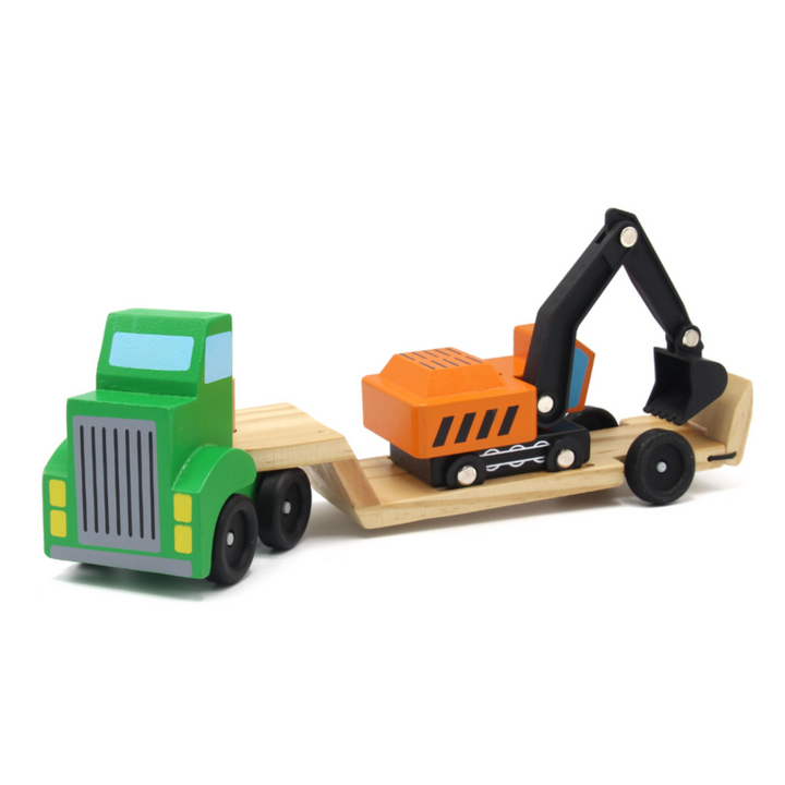 Camión de madera con retroexcavadora en acoplado
